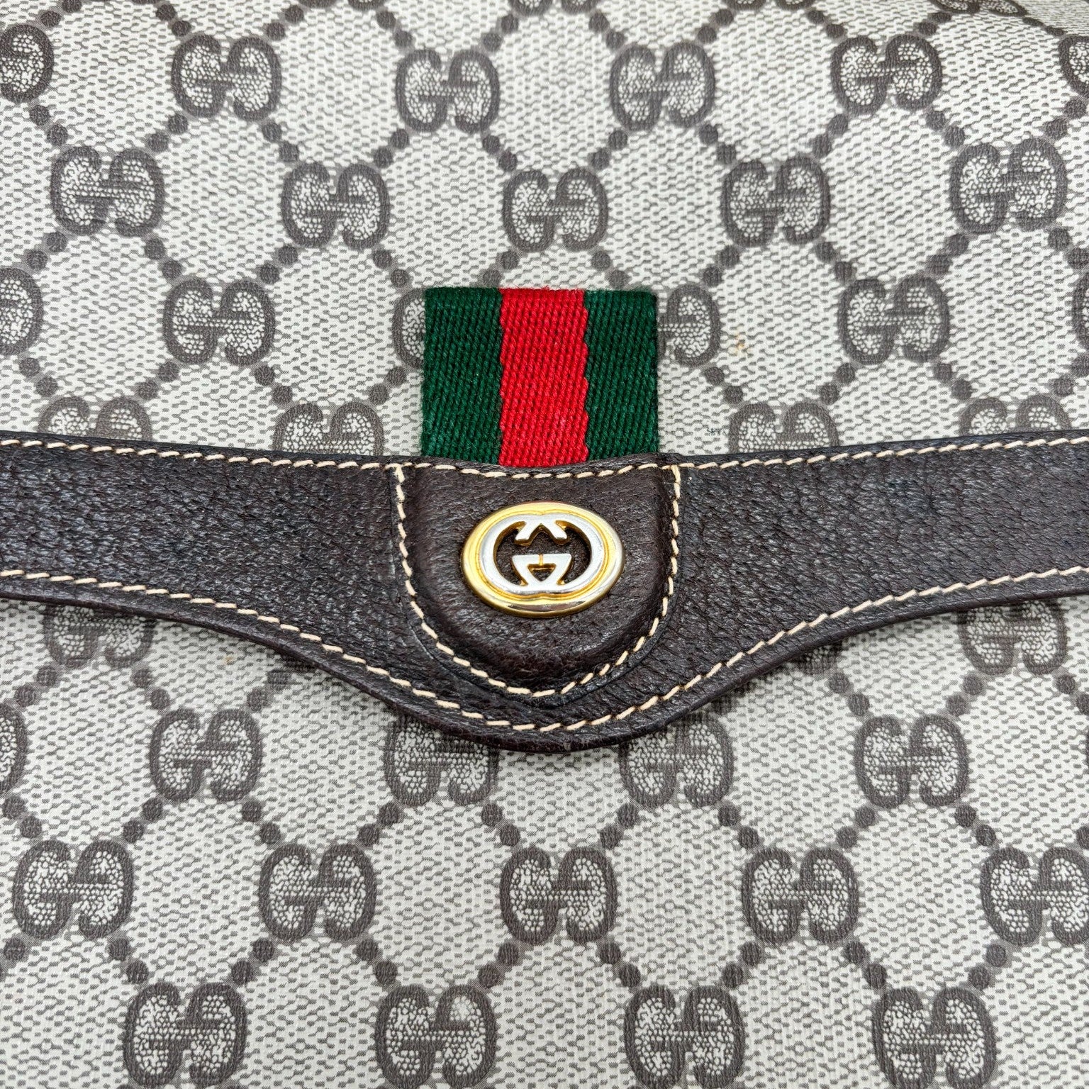 Das äußere GG Supreme Canvas sowie die Lederdetails befinden sich in sehr gutem Zustand mit nur leichten, altersüblichen Gebrauchsspuren. Die Struktur des Canvas ist schön erhalten, die Farben der Webstreifen klar und gleichmäßig.