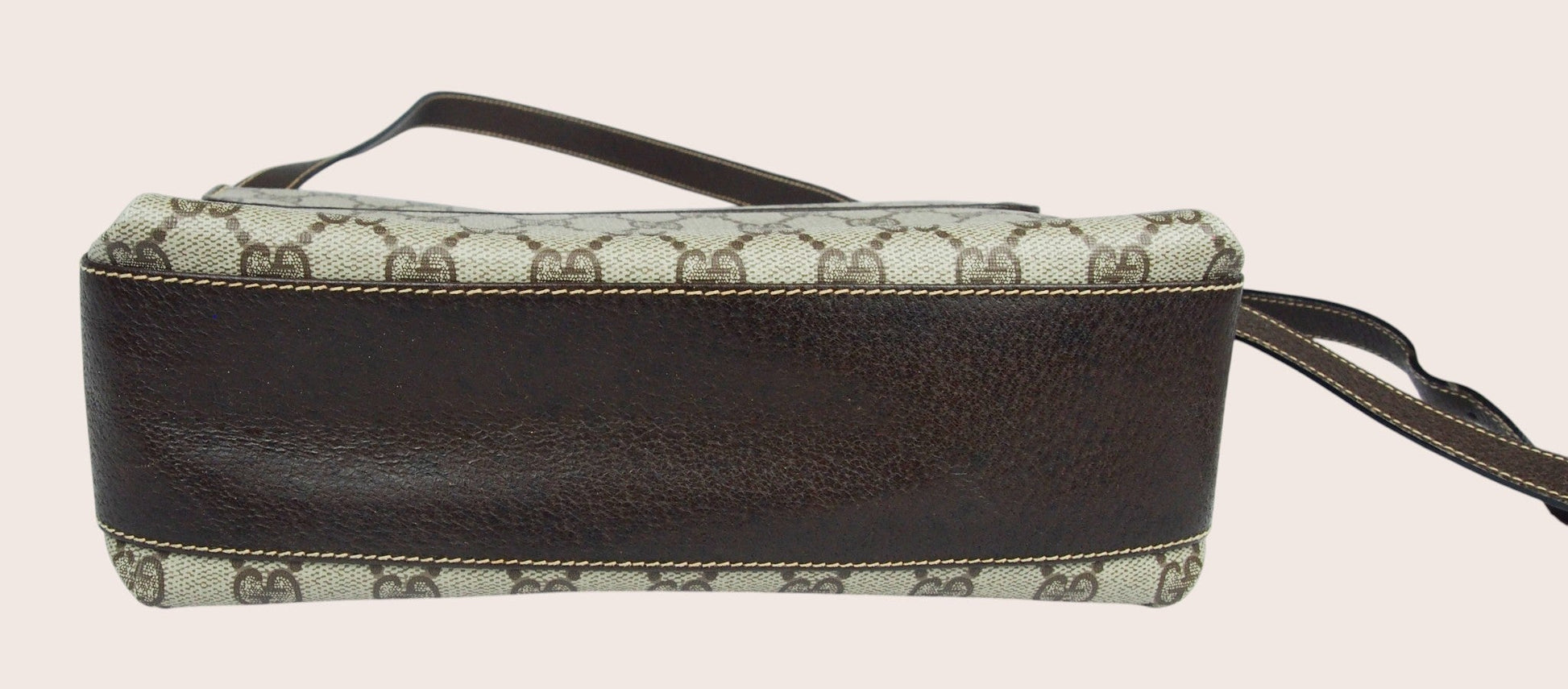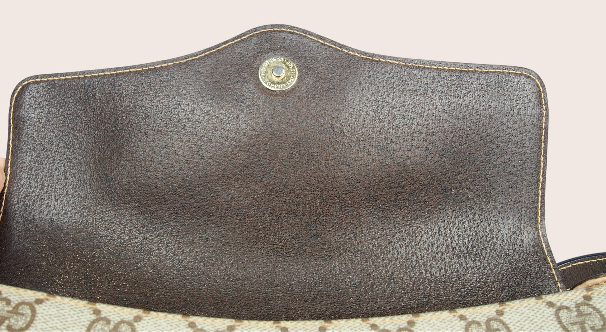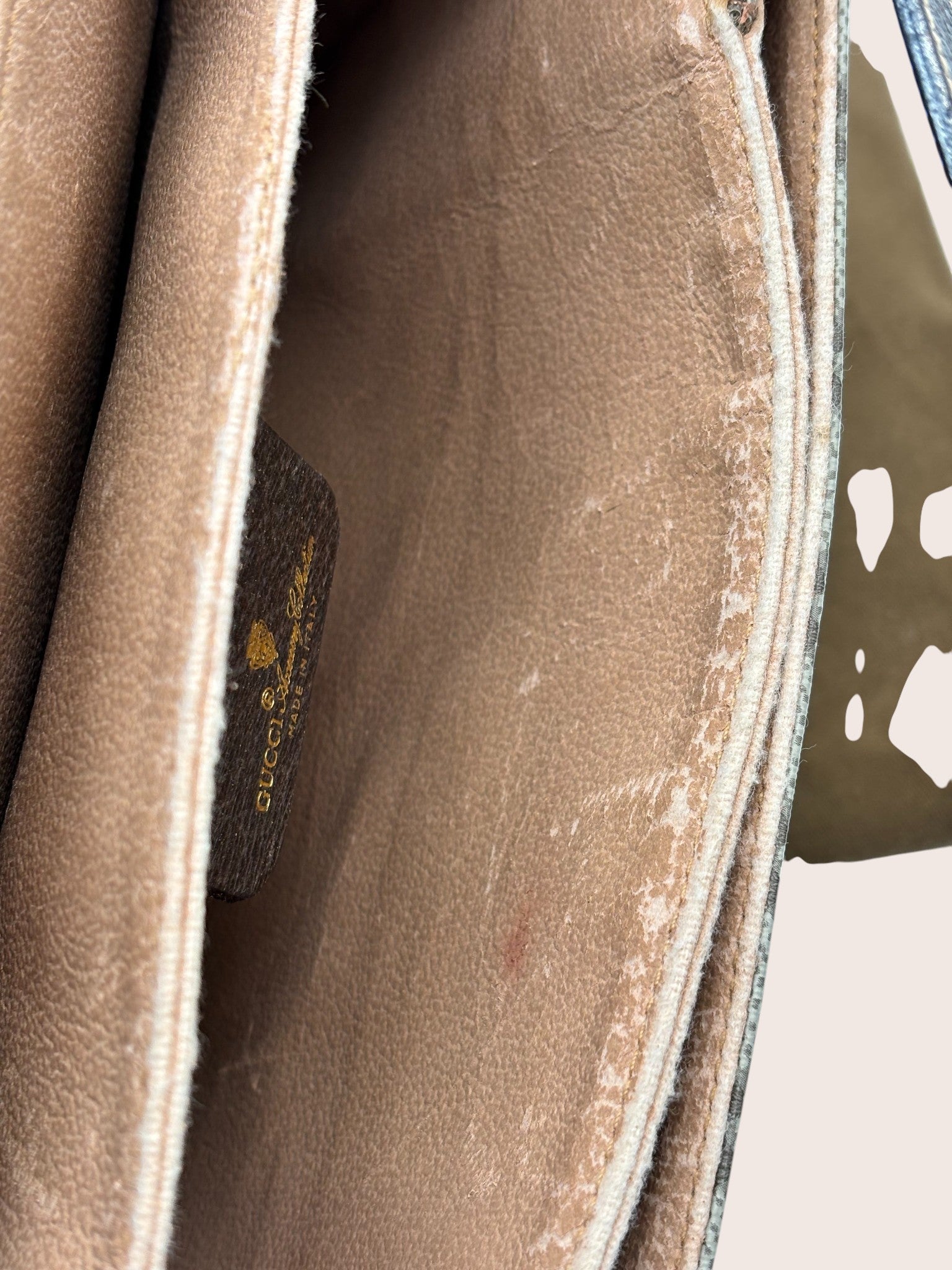 Das Innenfutter weist deutlichere Abnutzungsspuren auf, die dem Alter der Tasche entsprechen und auf den Detailfotos gut ersichtlich sind. Insgesamt handelt es sich um ein originales Gucci-Vintage-Stück mit ehrlichem Charakter und Geschichte.